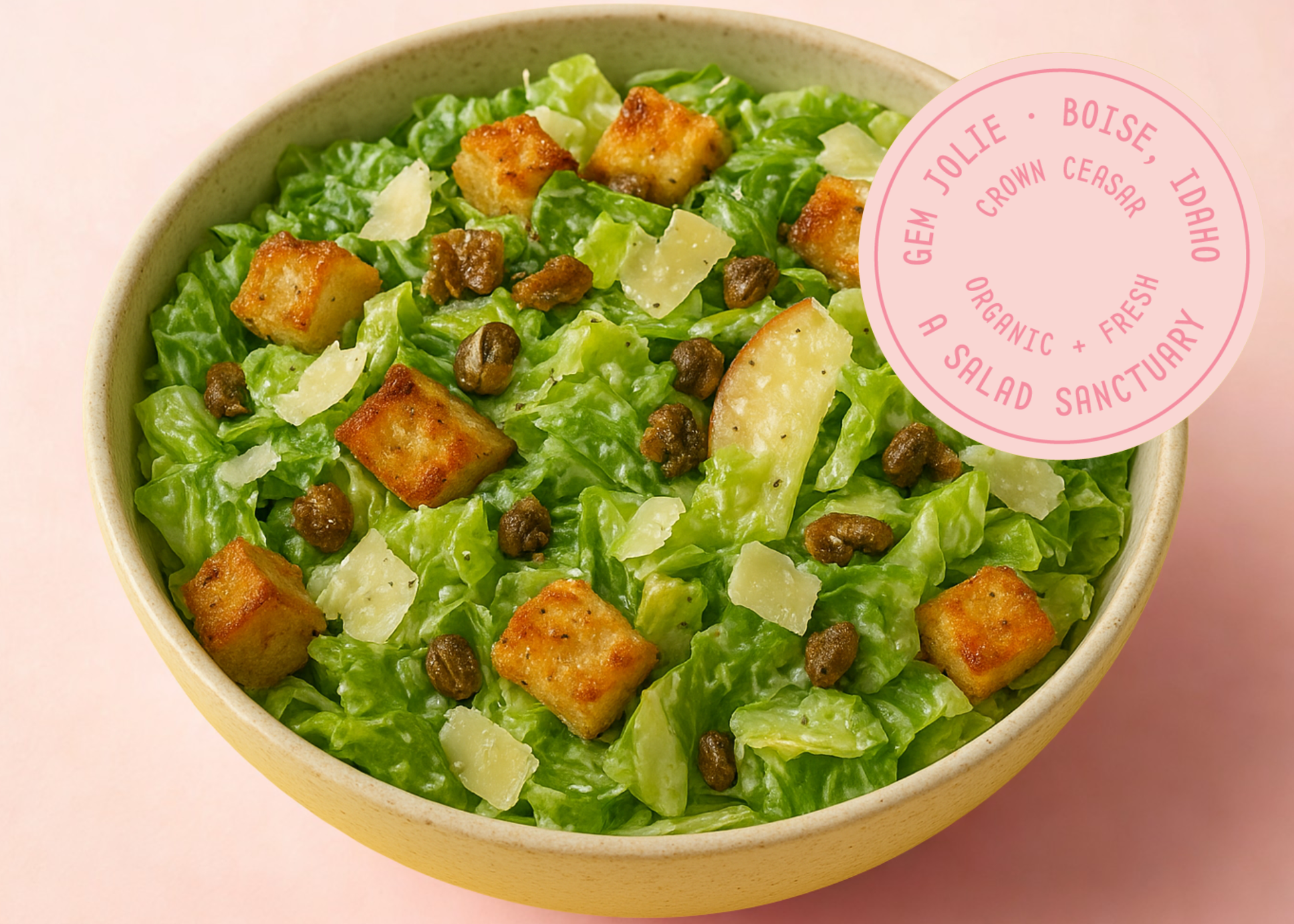 Crisp organic romaine leaves dressed in our culty + creamy House Caesar and topped with fried capers, burnt shallots, shaved parmesan, and homemade gluten-free Cloverstone croutons made in Boise. A golden, crunchy, and savory take on the timeless favorite. Add our organic flat iron steak and save it for supper.