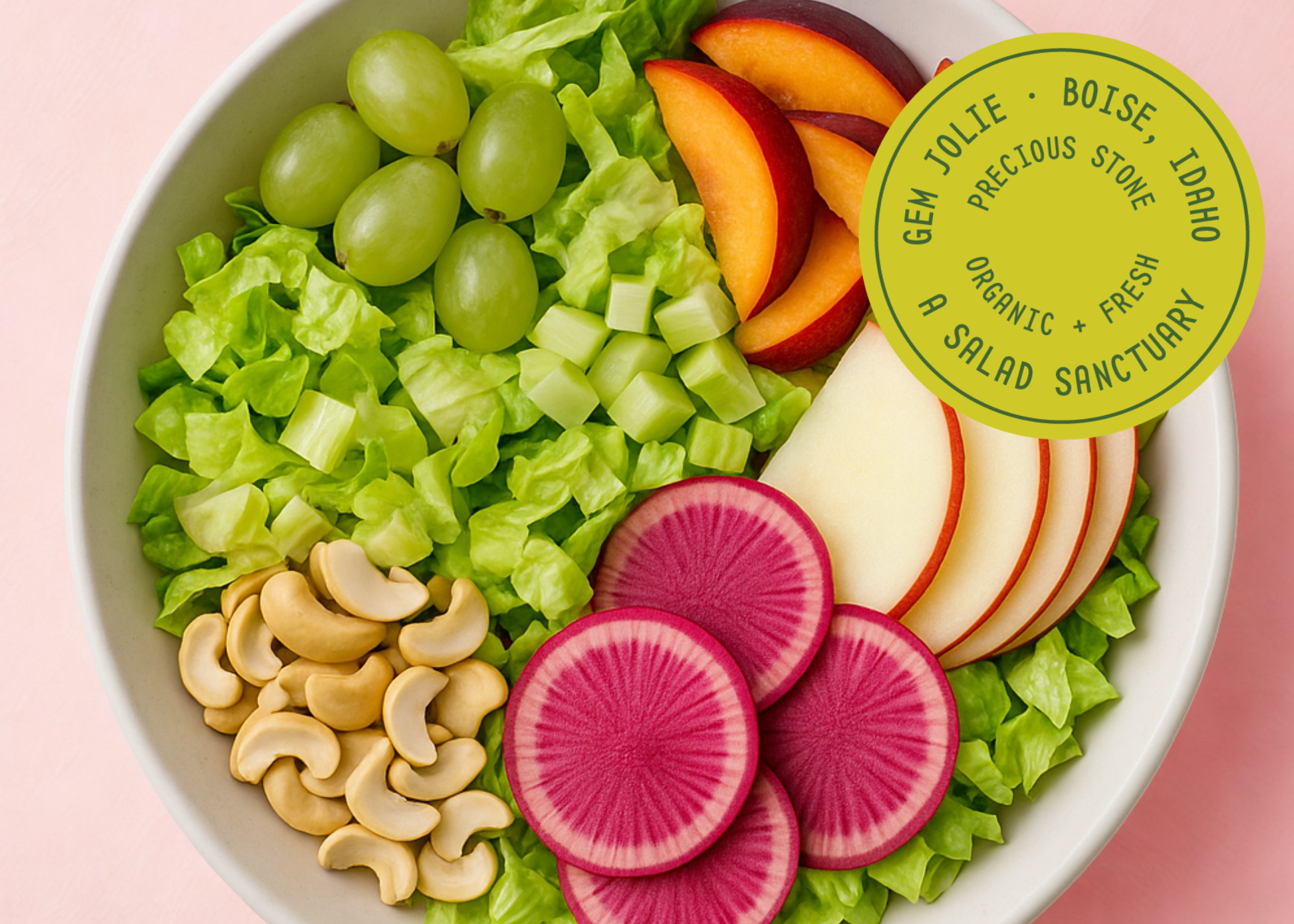 A reimagined Waldorf-esque salad that shines with a hybrid of romaine and iceberg lettuces, green grapes, seasonal stone fruits of peach and plum, Fuji apples, watermelon radish, celery, and cashew. Tossed in a fruit-forward vinaigrette with a foundation of tahini for depth and protein, this salad is both nostalgic and refreshingly new.