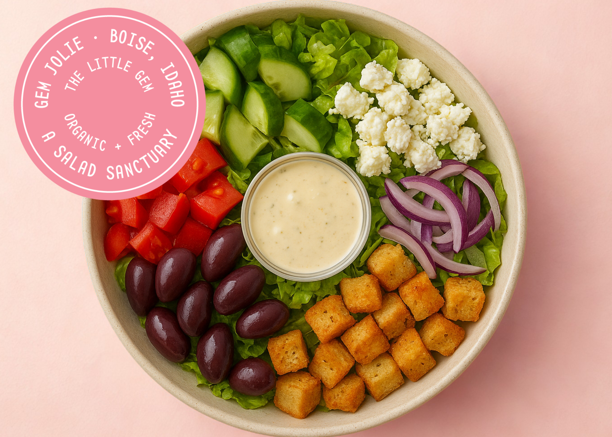 A jewel-toned take on the Greek classic. Romaine lettuce, cucumber, tomato, and red onion meet briny Kalamata olives, crumbles of local Ballard Family Farms Feta, and gluten-free Cloverstone croutons, all dressed in The Pink Stuff — Gem Jolie’s treasured dairy-free dressing, made of fresh squeezed Orange Juice, Zaatar, Rice Vinegar, Tahini, Dijon, Lemon juice, and Himalayan Pink salt. Colored organically with the pinkness of beets. Bold, earthy, and colorful, it’s a house staple that celebrates the flavor and sensory spirit of Gem Jolie.